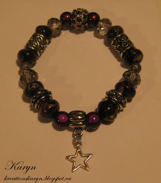 J'ai remarqué que les bracelets étaient populaires c'est temps-ci. Étant donné que c'était bientôt la fête de ma belle-soeur, je me suis dit que ca serait une bonne idée cadeau à lui faire. Je lui en ai donc fait un à ma façon avec des perles, dans les tons de mauve.